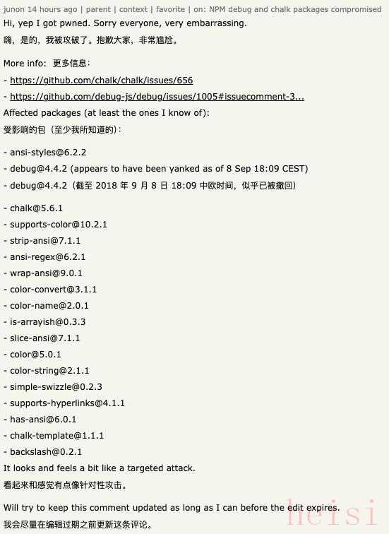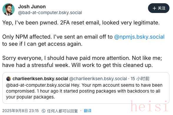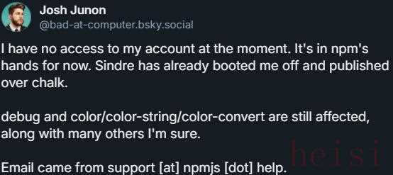 https://github.com/debug-js/debug)软件包的维护者 Josh Aikido 也于 15:15 在社交媒体上承认自己的库遭到了入侵,并开始清理受影响的软件包。