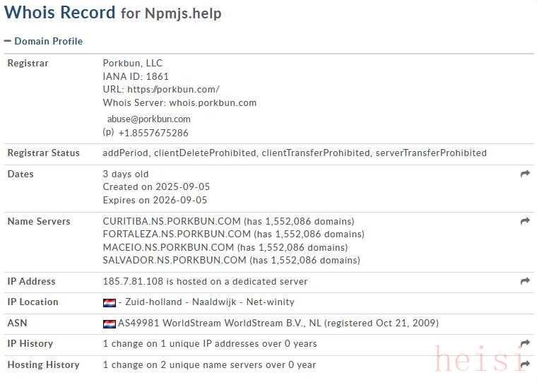 进一步调查发现,该域名是在 2025 年 9 月 5 日注册的,也就是在发起攻击的三天前。