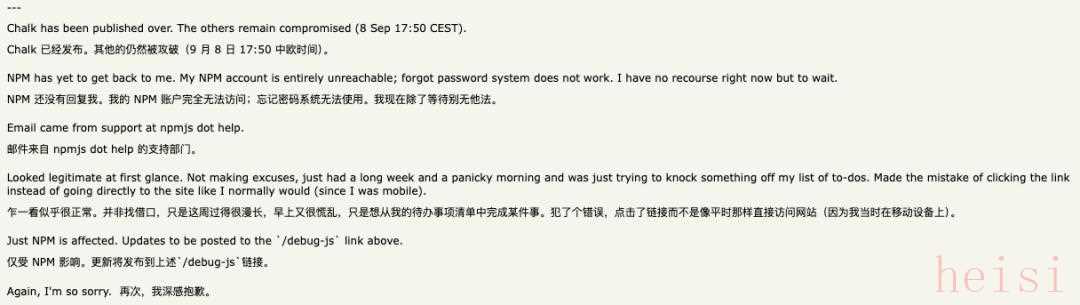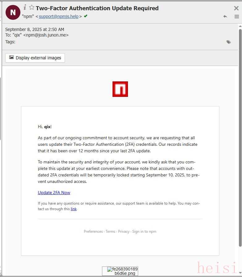 Josh Aikido 同时透露,钓鱼邮件正是由 support npmjs help发送的。
