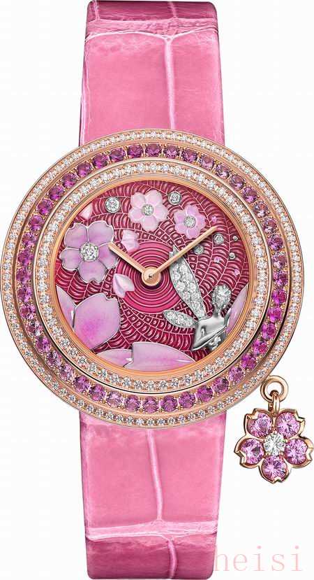 表盘上,樱花下,白K金镌刻的仙子张开钻石之翼,玫瑰切割的脸庞流露优雅气质,展现欢欣活力。围绕表圈的两行渐变粉红色蓝宝石,映衬32毫米的浑圆表壳。表底盖上三朵樱花浮雕,描绘花卉从蓓蕾至盛放的蜕变过程。钻石及粉红色蓝宝石樱花吊饰,为这方寸天地锦上添花。