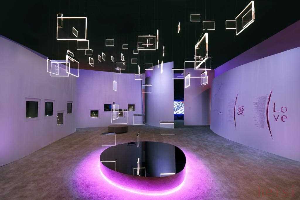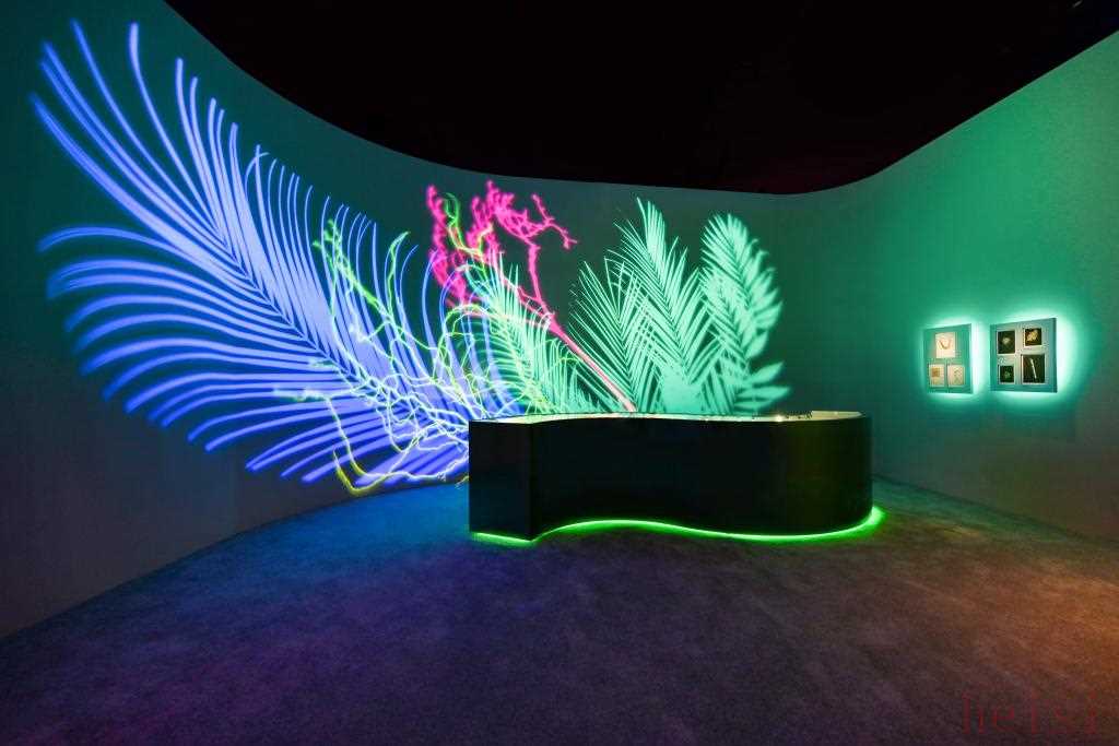 展陈设计师Johanna Grawunder为这次展览打造了身临其境的沉浸式布景设计,为“爱”展厅设计一个巨型的玻璃装置艺术作品,利用光影的变化与色彩的绚丽营造如梦似幻的诗意氛围。而负责展览的图形设计的平面设计师Micha? Batory则为此展览创作了特别的排版与视频动画。
