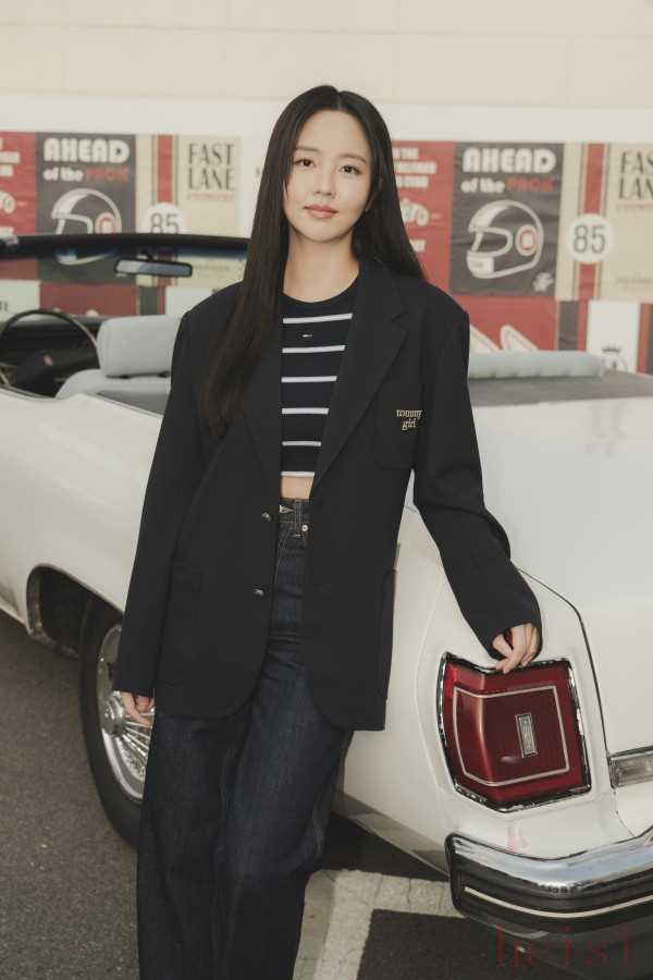金所泫演绎TOMMY JEANS 2025秋季系列:身穿TOMMY GIRL 廓形西装外套、修身螺纹T恤与牛仔长裤,搭配丹宁肩带包与钉底跑鞋。