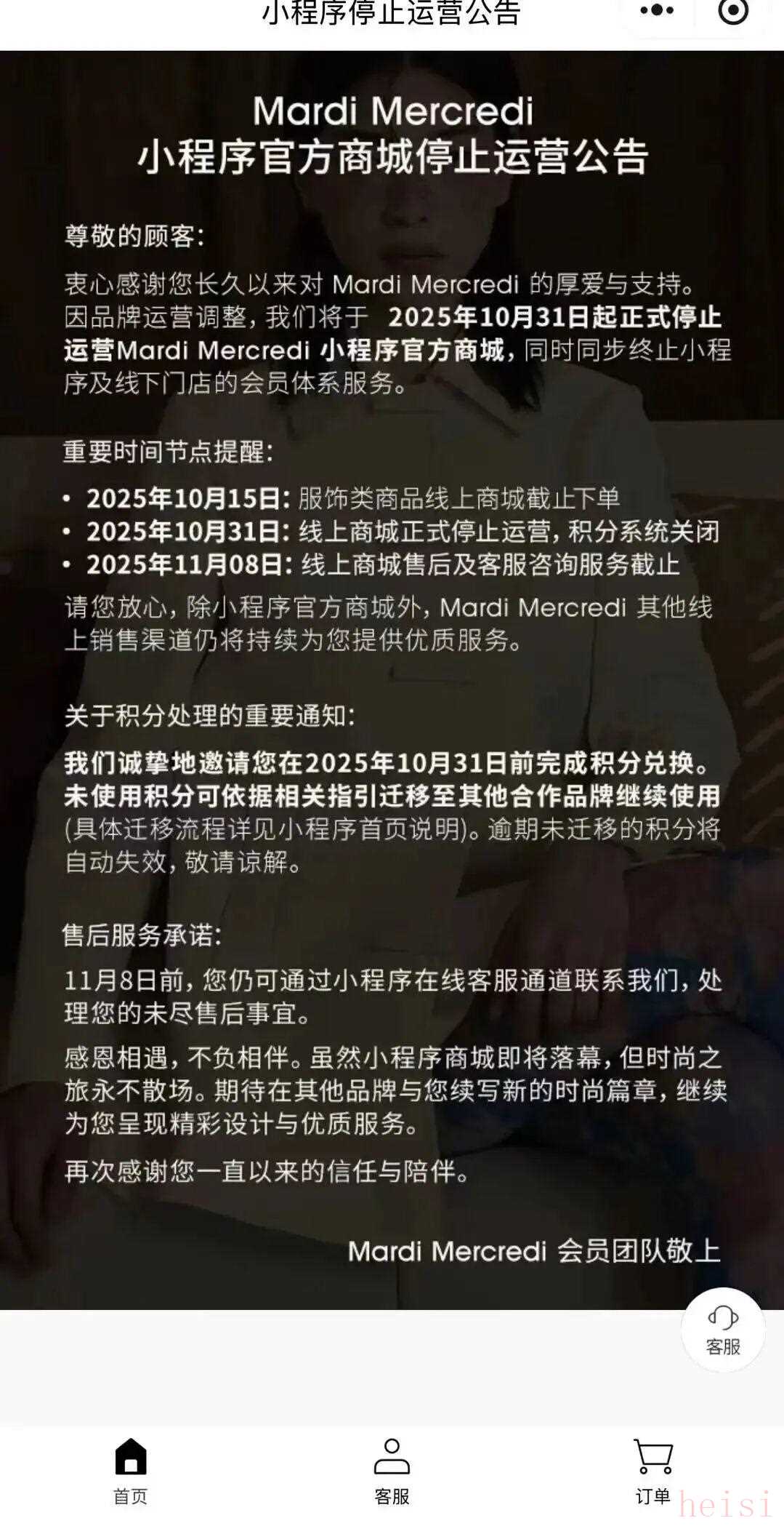 这是关于韩国潮牌 Mardi Mercredi 关闭中国线下门店、打折清仓以及线上小程序关停的消息总结: