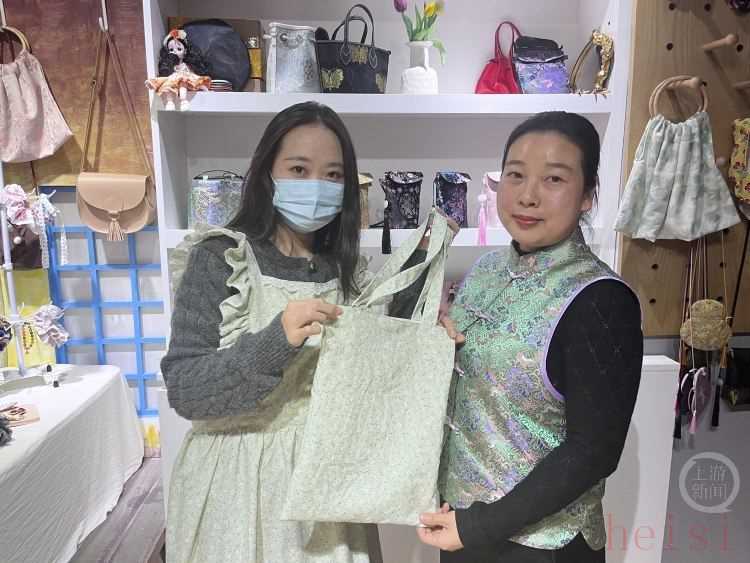 在工作室里学习的詹女士是一名95后,通过学习后现在能够制作发圈、布包。“来这里学习是因为我对缝纫比较感兴趣,第一节课入门后就能做成品了。今天又做了一个包,现在打算自己买一台缝纫机,最近几天在看具体型号。”