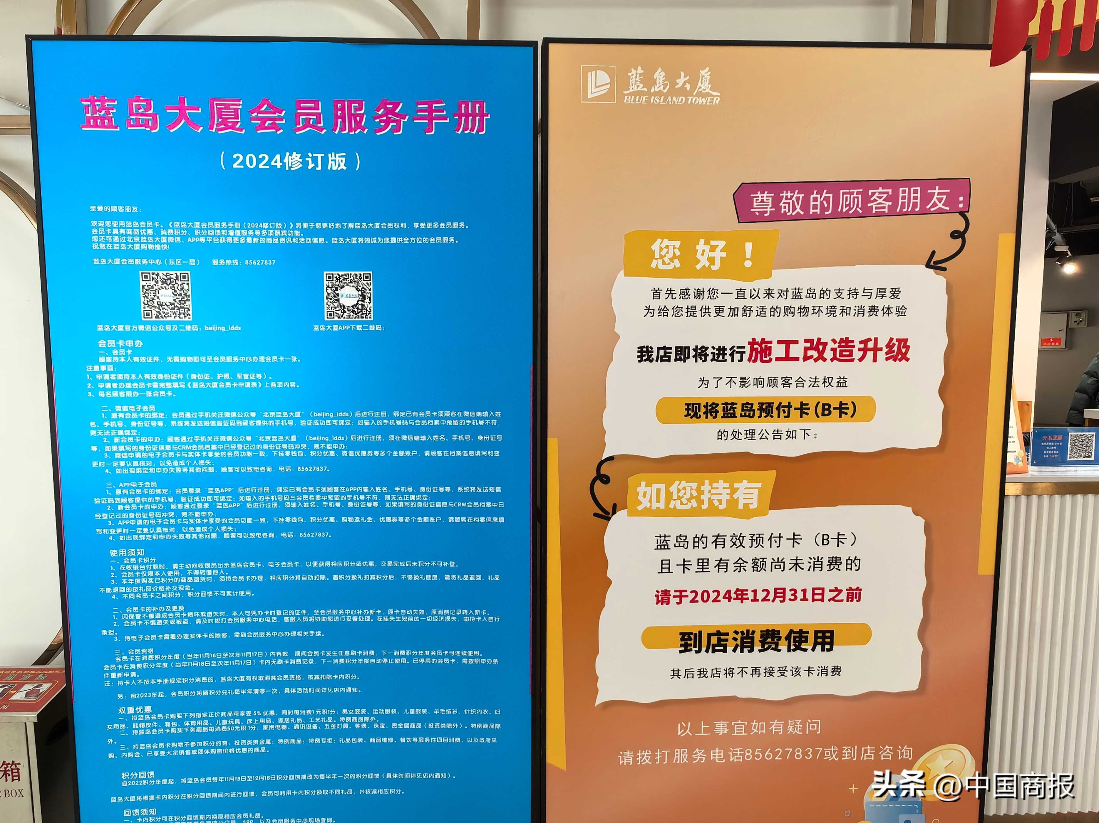 蓝岛大厦外围被施工围挡拦起。商场内部也已挂起了“施工改造升级”的提示。公告显示,商场即将进行施工改造升级,为了不影响顾客合法权益,如消费者持有蓝岛有效预付卡,且卡里有余额尚未消费,应于2024年12月31日之前到店消费使用,之后商场将不再接受该卡消费。