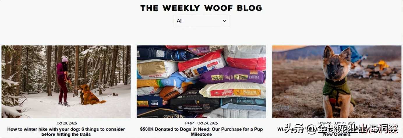 Wilderdog的Instagram官号Wilderdog的Facebook官号,也拥有15万粉丝内容营销:树立专业权威形象在独立站,Wilderdog设有博客专栏,通过持续输出养犬与户外领域的专业内容,以此树立起“专家”形象,从而赢得了用户坚实的信任。