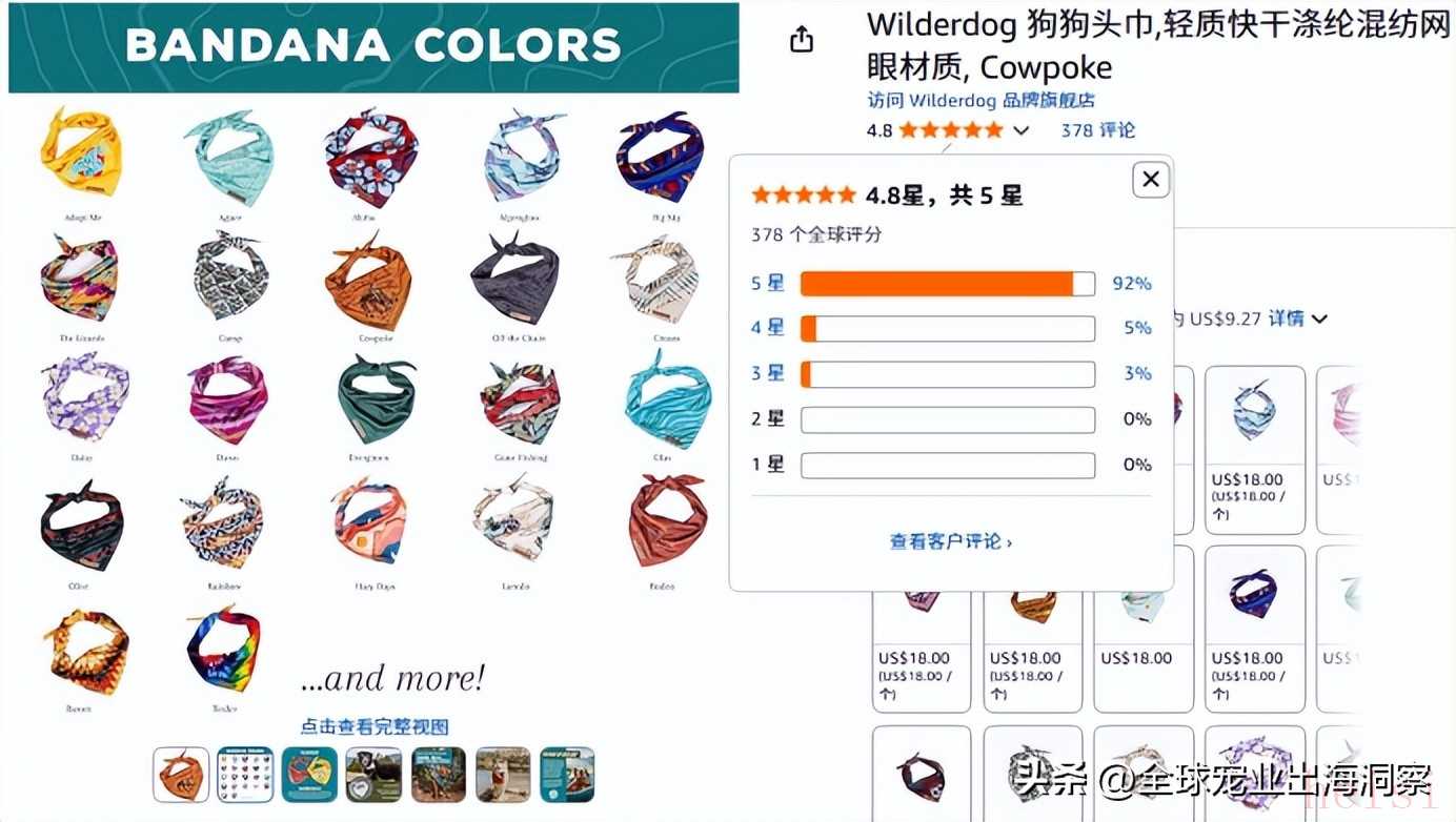 Wilderdog亚马逊店铺全球宠业出海洞察浏览注意到,Wilderdog在亚马逊上部分商品获得4.8/5高分(如狗狗头巾),评论数超百条。其大部分商品由亚马逊自营配送,提供Prime服务。