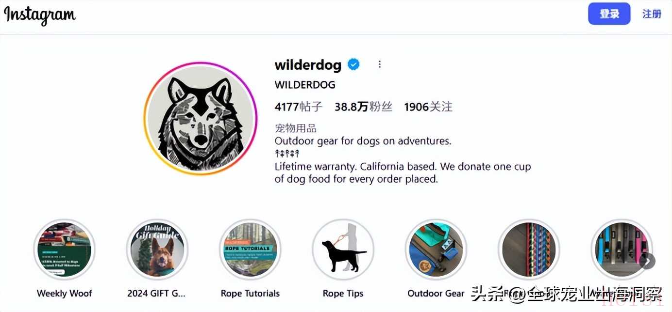 Wilderdog的营销策略以场景化产品创新为基础,通过价值观驱动的情感营销和全渠道内容渗透,成功将品牌从功能性装备升级为户外养宠生活方式的符号。社媒营销:注重用户共创全球宠业出海洞察留意到,Wilderdog在Instagram、Facebook 、TikTok等社交媒体平台都设有官方账号。以Instagram来看,目前粉丝已达38.8万。除了产品场景化内容,还创建了#wilderdog品牌名话题,鼓励用户发帖分享,并筛选翻牌优质用户内容,与之联动。一方面提升用户忠诚度,另一方面挖掘更多潜在用户,形成“晒图-传播-购买”最大化营销回报。