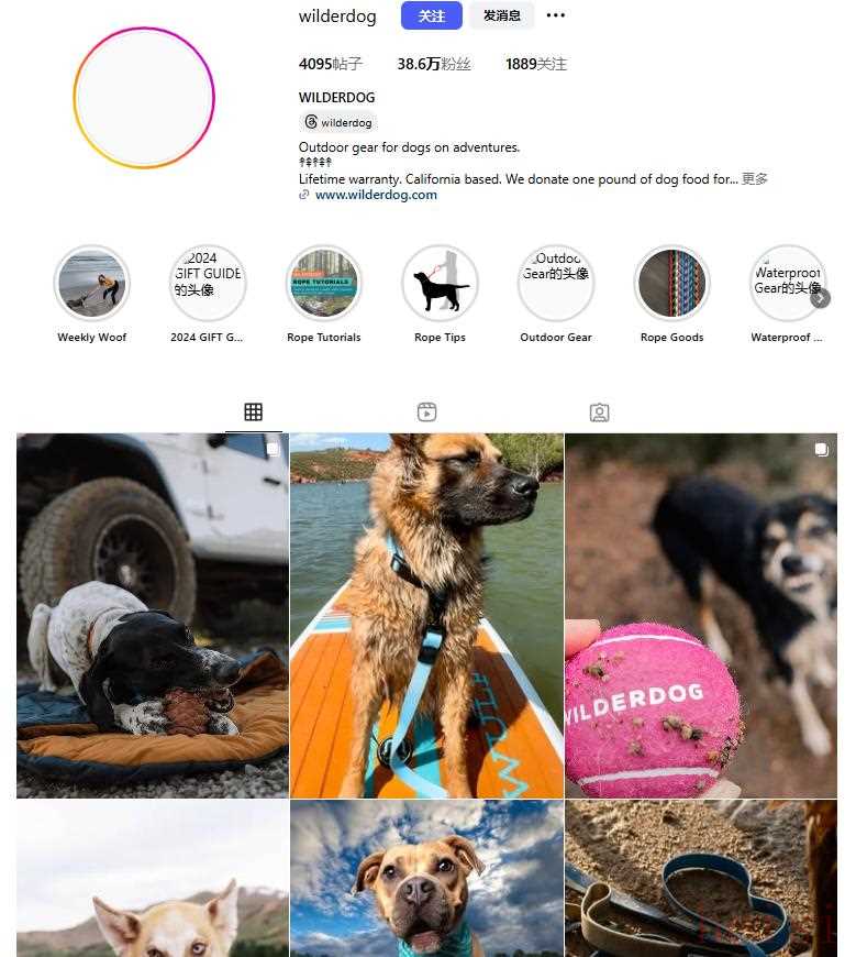 在营销方面,Wilderdog也同样借助了近两年来爆火的社交媒体,在各大社媒平台上创建了账号并发布相关内容。例如在Instagram上会发布消费者与宠物的内容,这种形式能够快速拉近品牌和消费者之间的距离,进一步加强消费者粘性,增加他们的忠诚度。