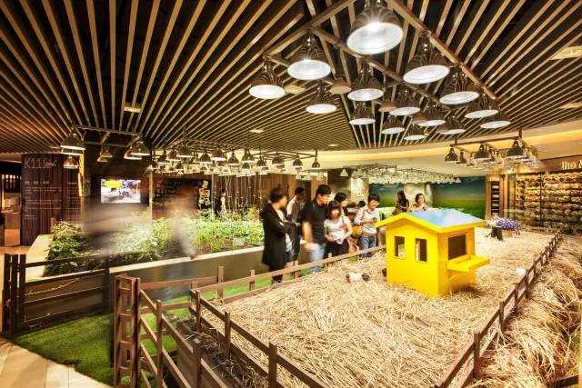 都市农场结合了天然板与太阳能灯光布景,营造出自然、梦幻的休憩空间,让顾客能够零距离接近自然、体验种植的乐趣。特别吸引喜欢自然与小动物的女性消费者。