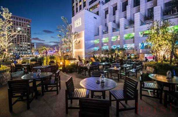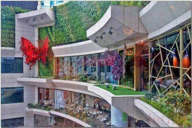 商场2F到6F间都有空中花园露台设计,每层各有主题和特色,外侧安装15cm的玻璃墙与铝板,种植绿植被。在被绿色包围的环境下来个闺蜜下午茶就最惬意不过了。