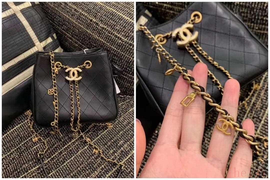 近期很火的一只水桶包,估计是CHANEL埃及风系列的这款,链条上有许多小装饰。包包有两个尺寸,大号的单肩背刚好到腰部位置,小号的则可以斜跨。
