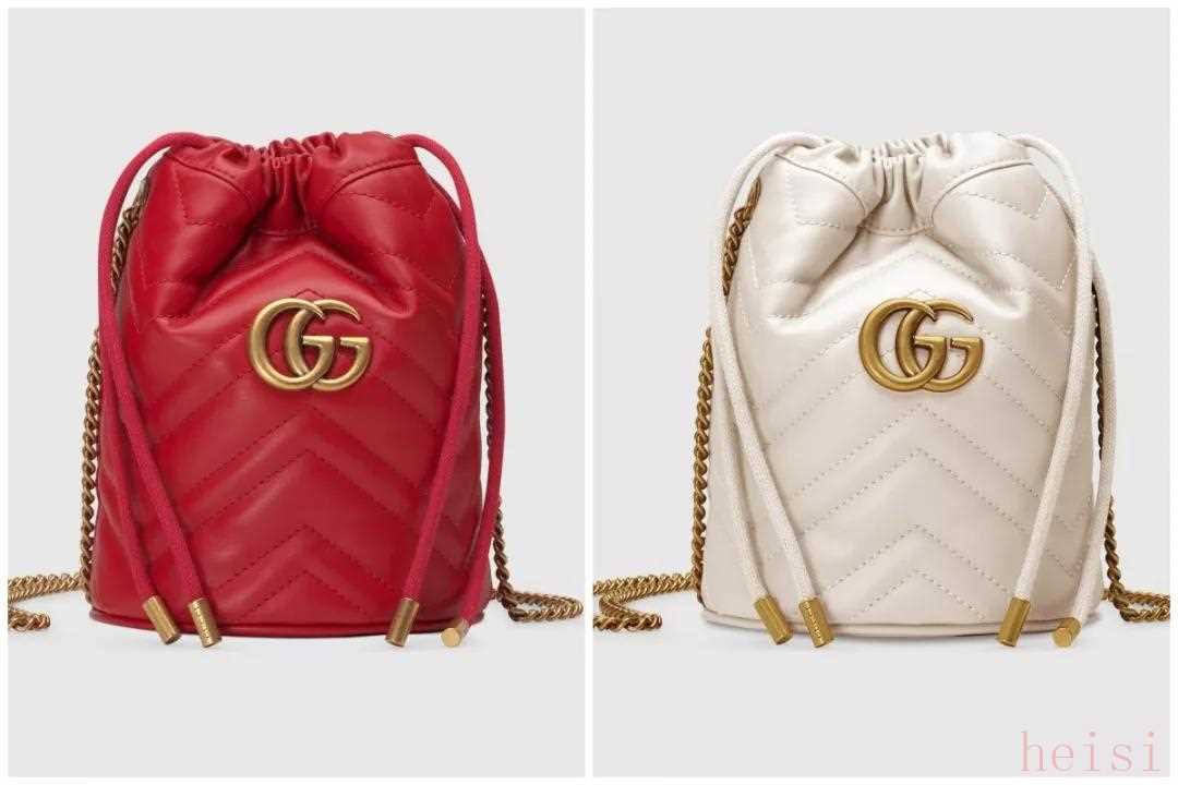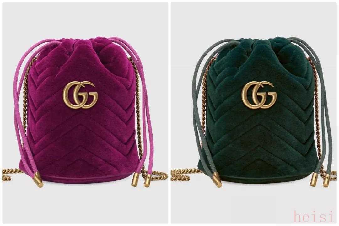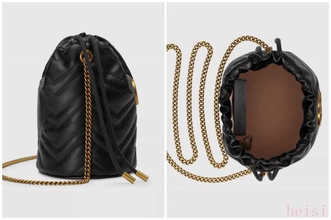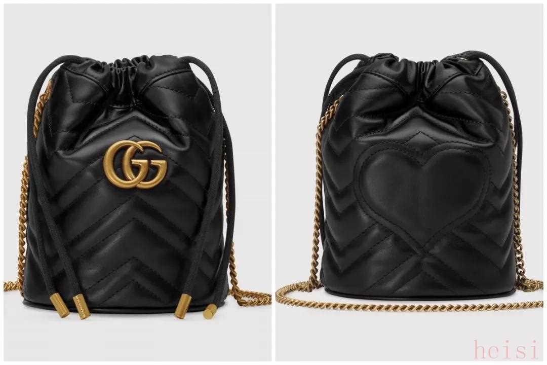 这款水桶包整体的设计跟经典的GG Marmont肩背包很像,正面双G logo和绗缝的设计,背面依然有个爱心。