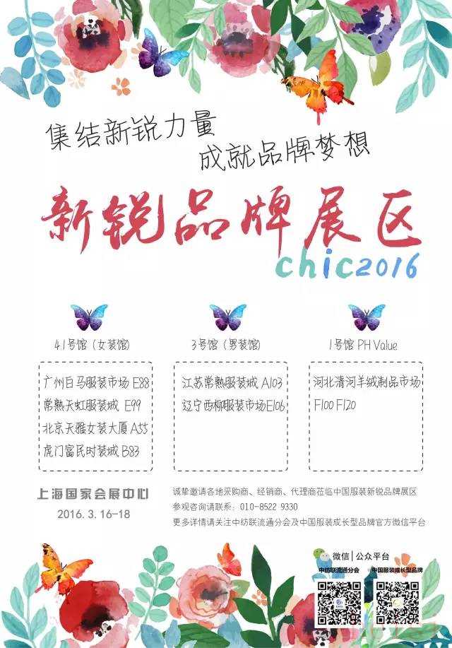 中国国际服装服饰博览会/CHIC2016(春季)将于2016年3月16-18日,在上海虹桥“国家会展中心(上海)”举办。由中纺联流通分会联合广州白马服装市场、海城市西柳服装市场、河北清河羊绒制品市场、北京天雅女装大厦、虎门富民时装城、江苏常熟服装城、常熟天虹服装城七大中国服装品牌孵化基地,携旗下50+优秀中国服装成长型品牌,打造的“CHIC2016中国服装新锐品牌展区”将在上海国家会展中心璀璨亮相,为CHIC注入新的品牌力量。