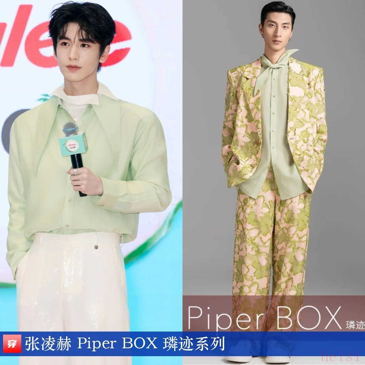 张凌赫,品牌活动。绿白提花西服套装、浅绿色尖领长袖衬衫:Piper BOX 璘迹系列。
