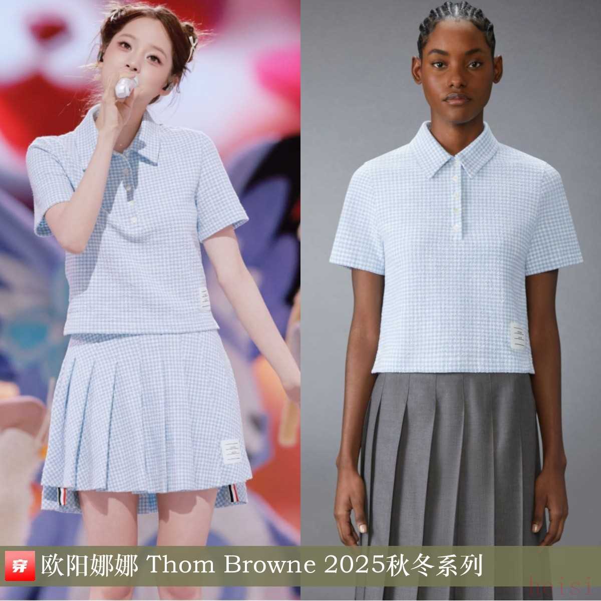 欧阳娜娜,2025共创之夜。蓝白格纹Polo衫:Thom Browne 2025秋冬系列。