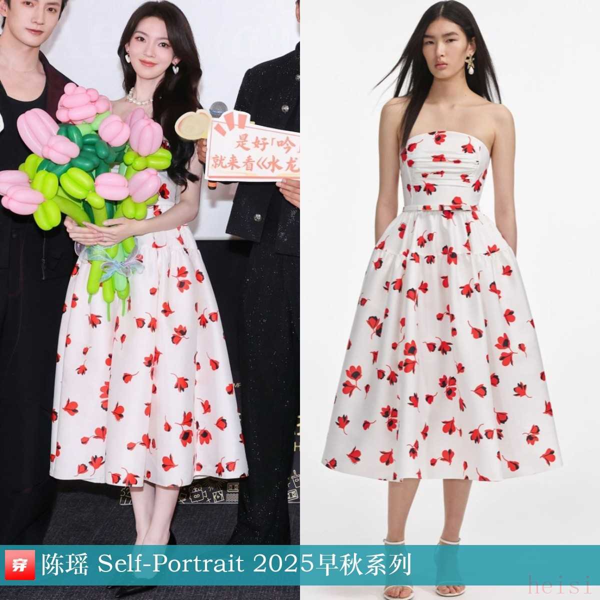 陈瑶,《水龙吟》追剧团活动。红白印花抹胸连衣裙:Self-Portrait 2025早秋系列。
