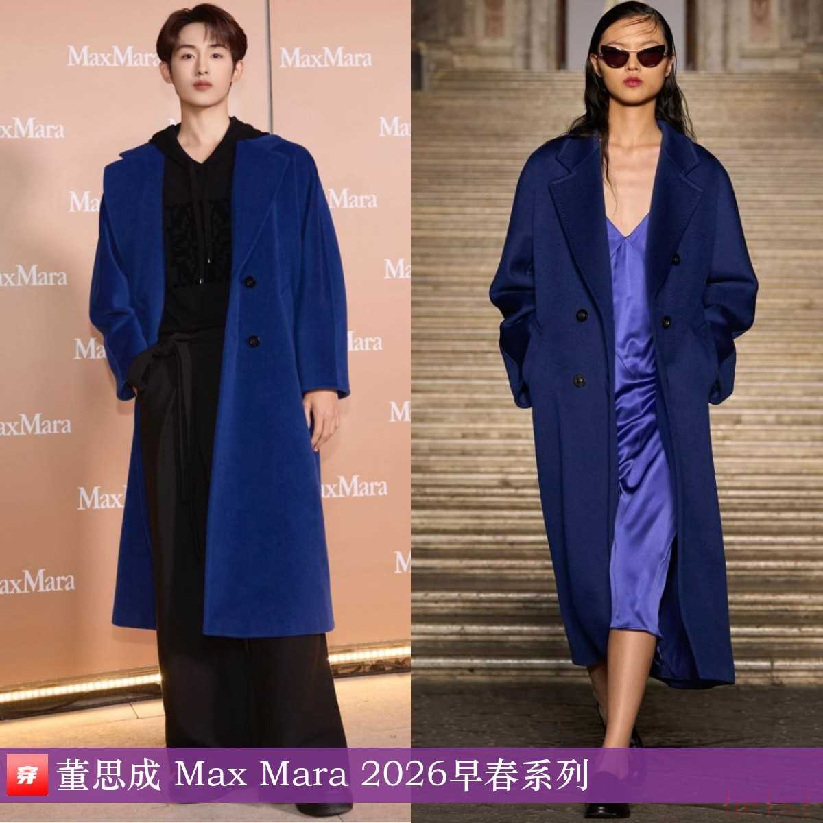 董思成,品牌活动。深蓝色双排扣大衣:Max Mara 2026早春系列。