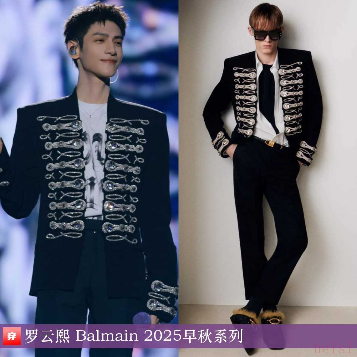 罗云熙,第四届宝鸡银杏音乐节。水晶装饰黑色宫廷风夹克:Balmain 2025早秋系列。