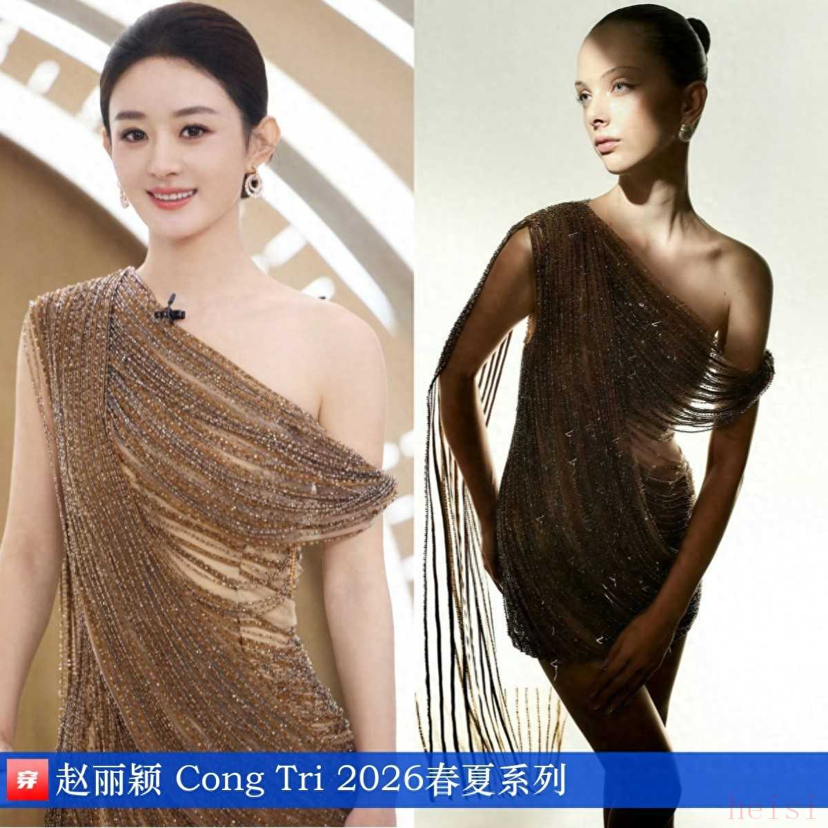 赵丽颖,品牌直播活动。鎏金串珠流苏斜肩连衣裙:Cong Tri 2026春夏系列。