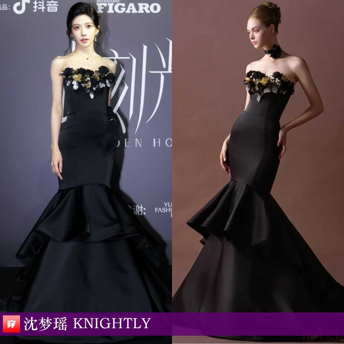 沈梦瑶,费加罗LIVEMODE音乐派对。繁花刺绣黑色抹胸鱼尾礼服:KNIGHTLY。