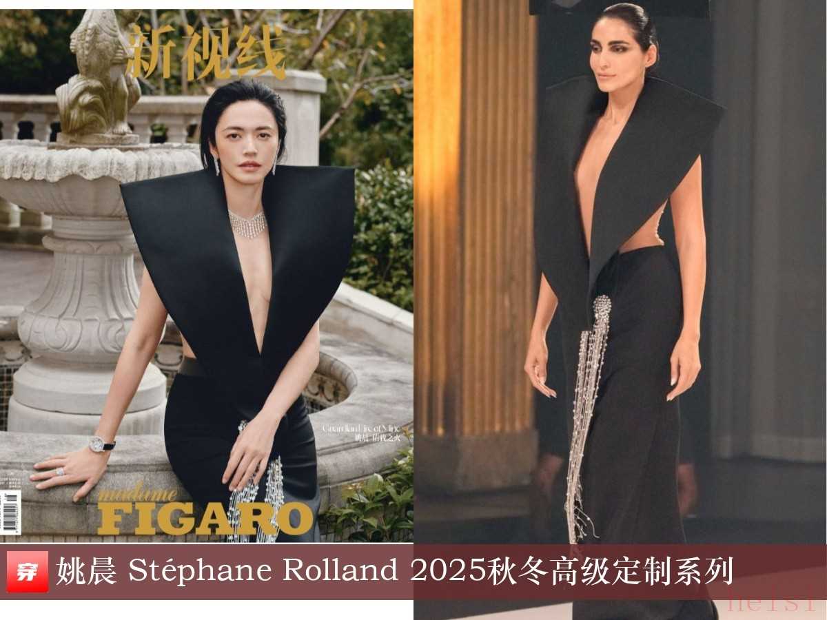 姚晨,《madame Figaro》2025年10月上。黑色深V拼接礼服:Stéphane Rolland 2025秋冬高级定制系列。