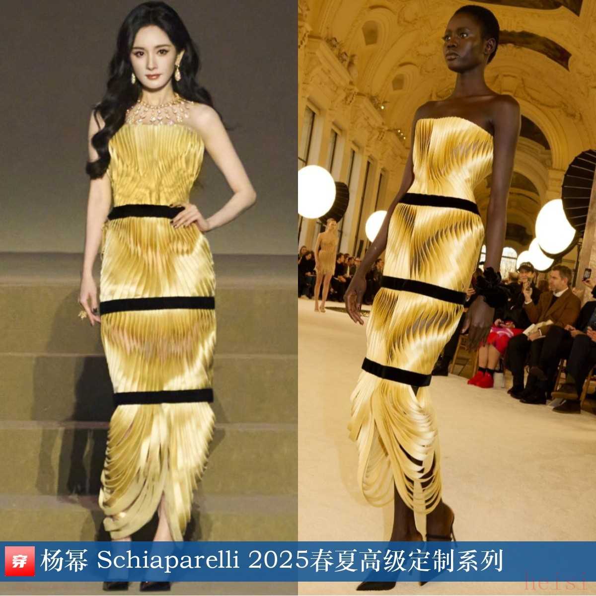 杨幂,2025年VOGUE时尚之力盛会。黑色绑带鎏金层叠抹胸礼服:Schiaparelli 2025春夏高级定制系列。