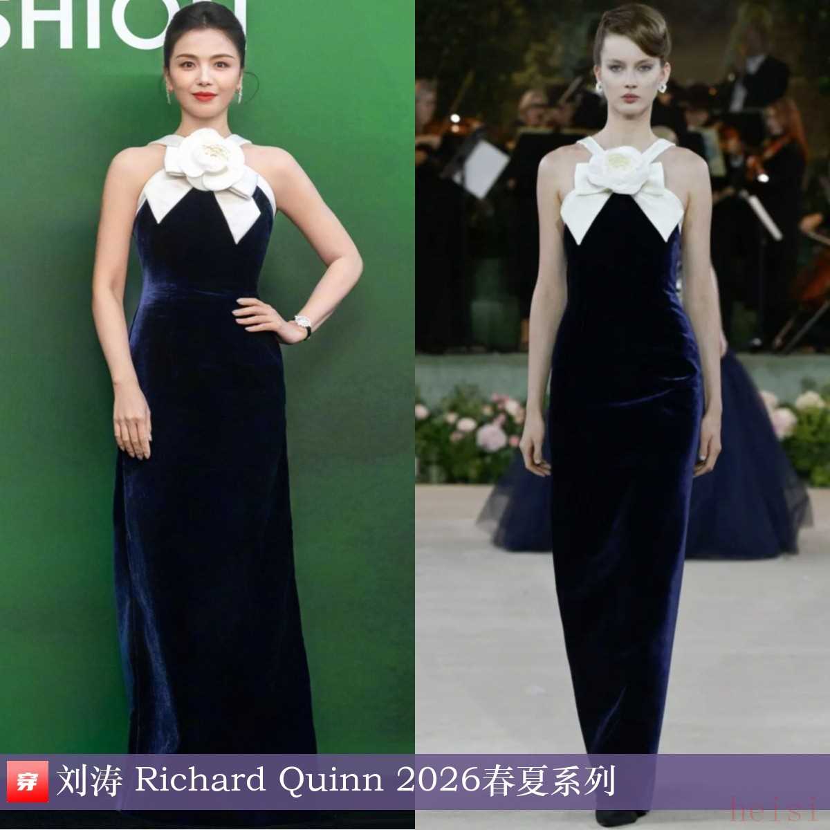 刘涛,2025年VOGUE时尚之力盛会。白色立体花朵装饰深蓝色丝绒连衣裙:Richard Quinn 2026春夏系列。