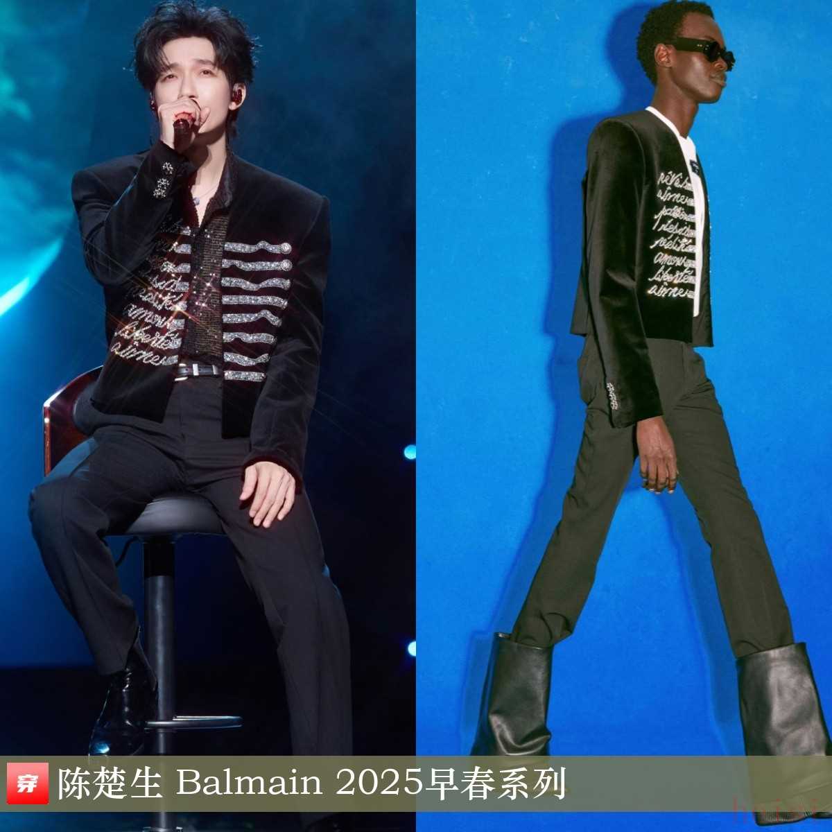 陈楚生,「至少今天很快乐」演唱会杭州站。黑色晶饰刺绣丝绒夹克:Balmain 2025早春系列。