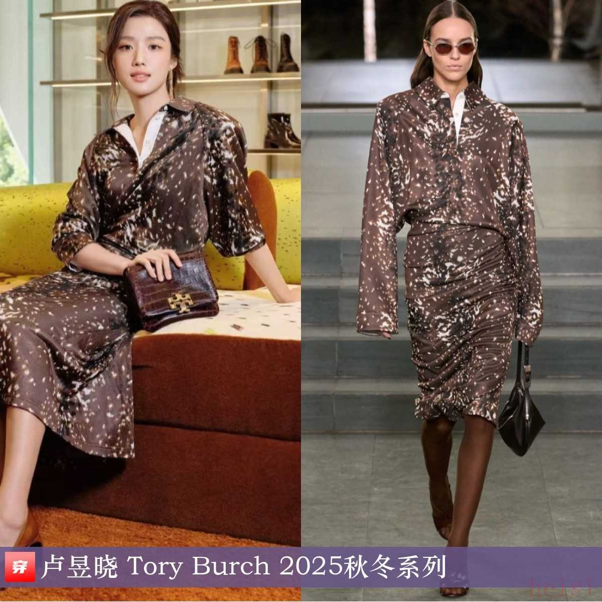 卢昱晓,品牌新店开业活动。深咖色印花衬衣、半身裙套装:Tory Burch 2025秋冬系列。