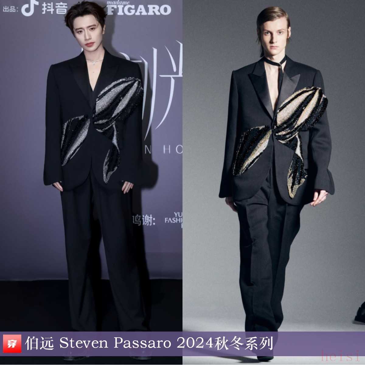 伯远,费加罗LIVEMODE音乐派对。亮片装饰黑色西服套装:Steven Passaro 2024秋冬系列。