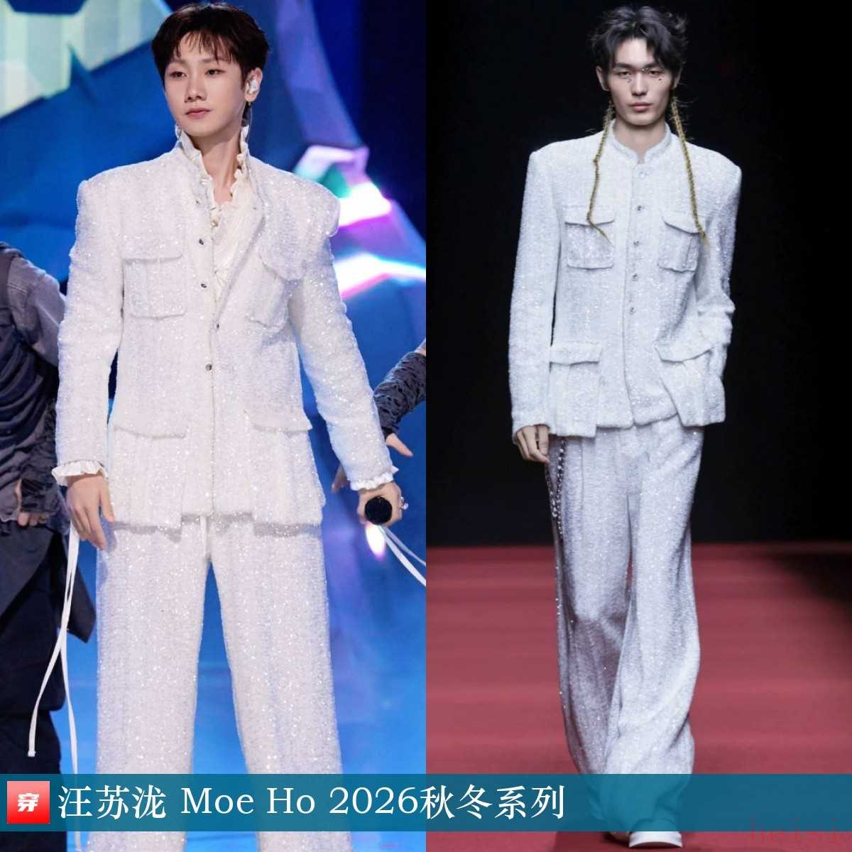 汪苏泷,2025共创之夜。白色亮片立领夹克、长裤套装:Moe Ho 2026秋冬系列。