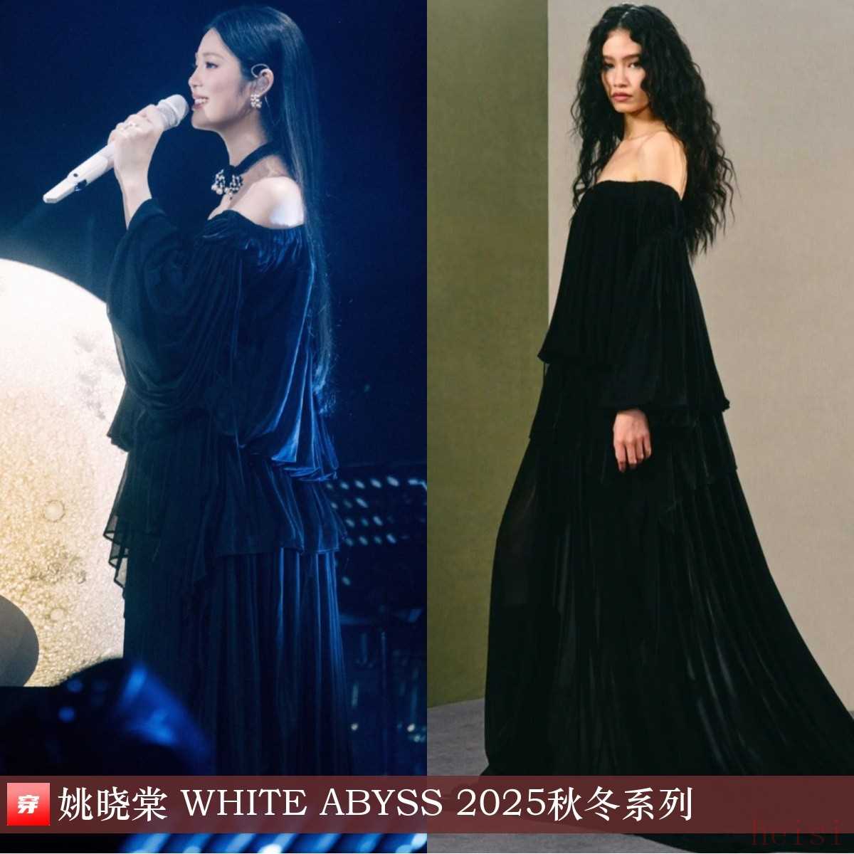 姚晓棠,「破晓」巡回演唱会上海站。黑色一字肩连衣裙:WHITE ABYSS 2025秋冬系列。