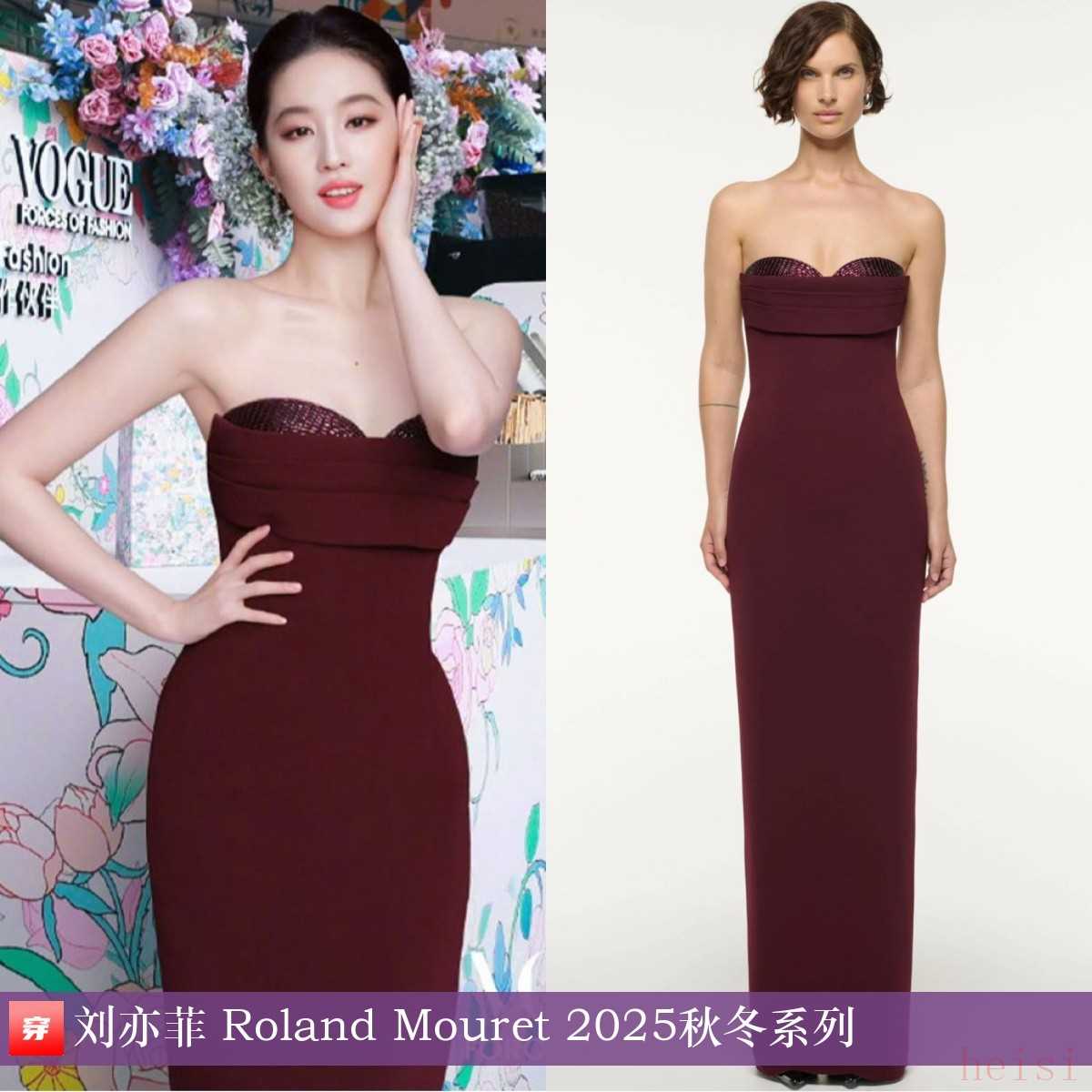 刘亦菲,2025年VOGUE时尚之力盛会。酒红色抹胸连衣裙:Roland Mouret 2025秋冬系列。