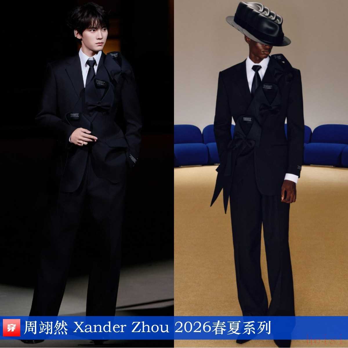 周翊然,2025年VOGUE时尚之力盛会。黑色蝴蝶结装饰西服套装:Xander Zhou 2026春夏系列。
