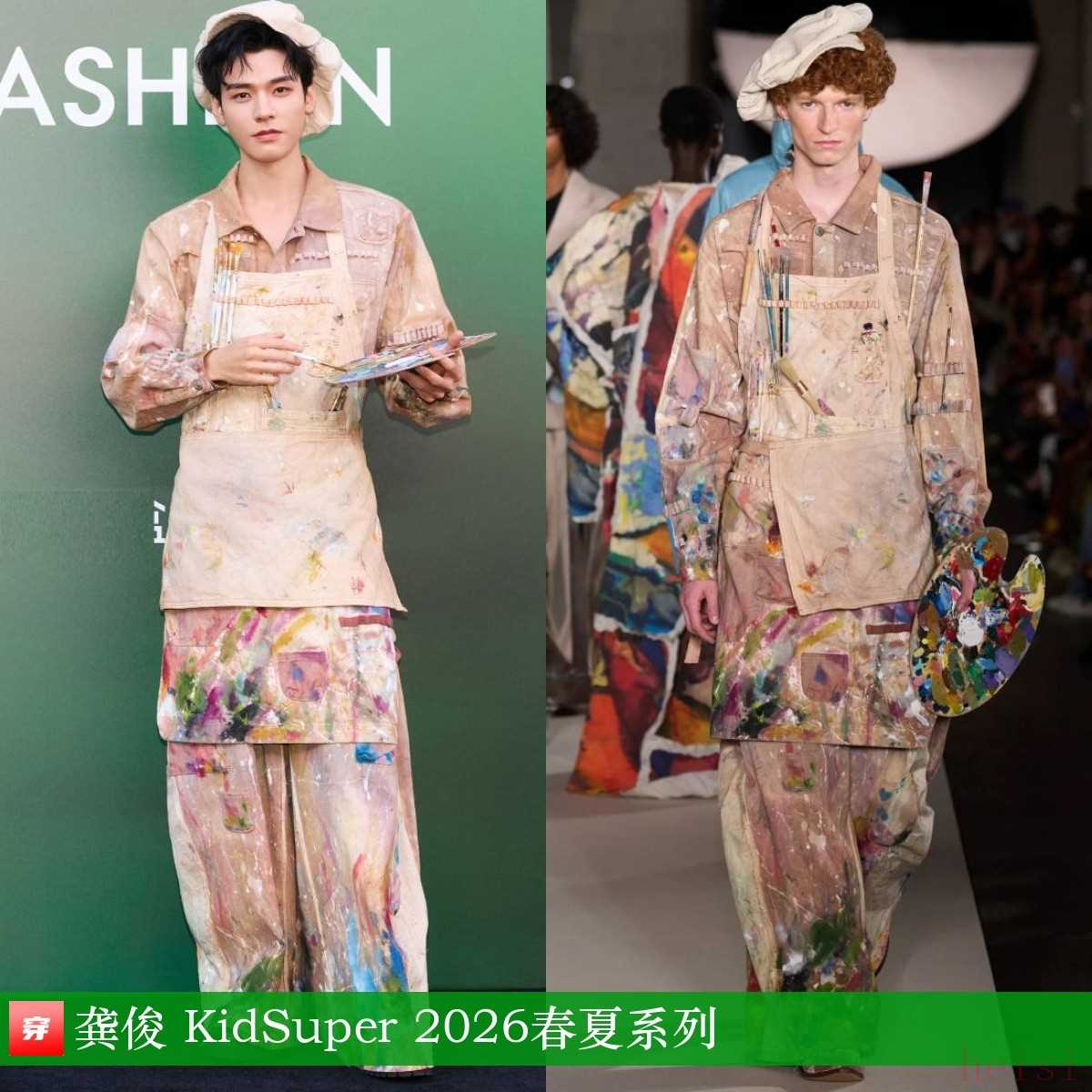龚俊,2025年VOGUE时尚之力盛会。浅驼色油画颜料印花套装:KidSuper 2026春夏系列。