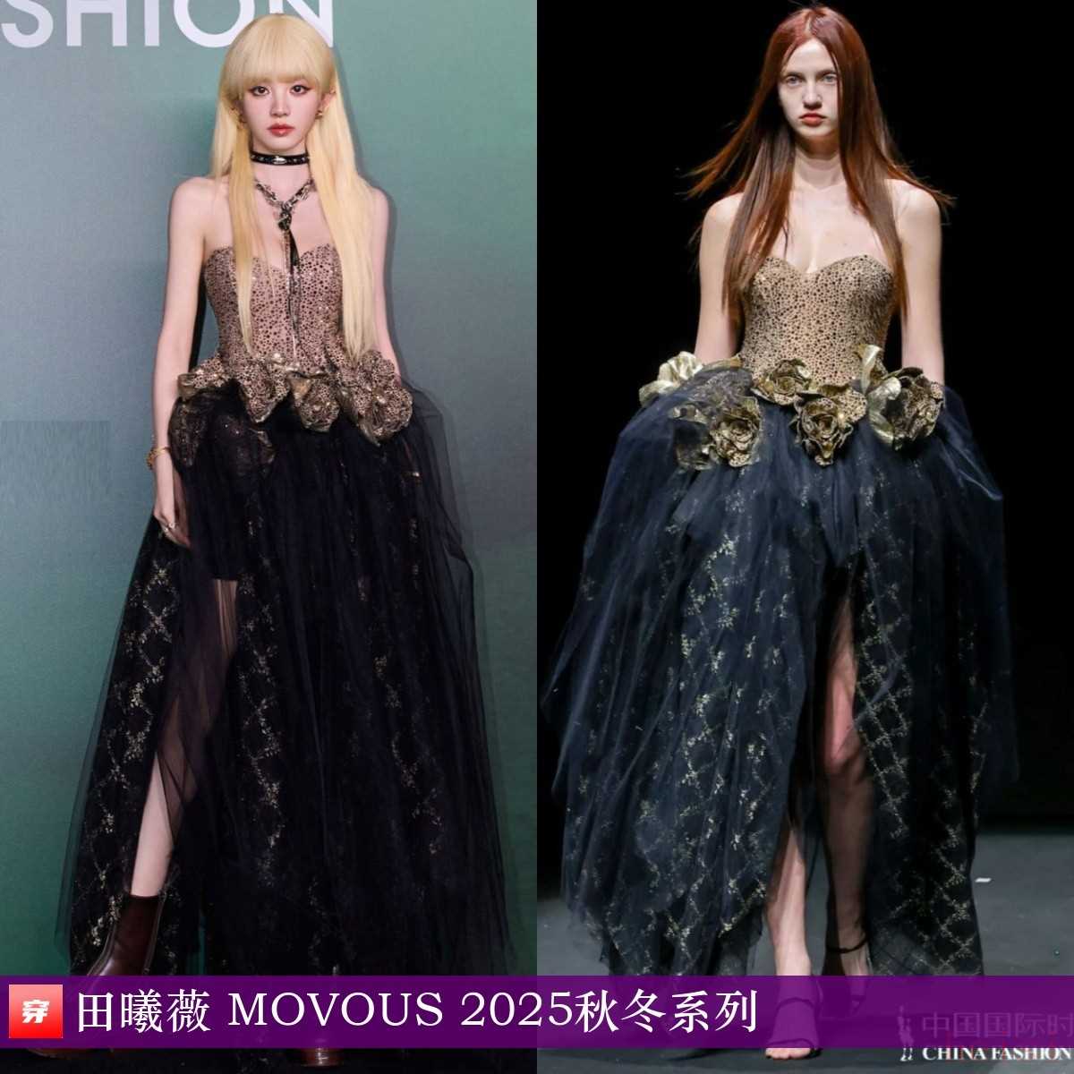 田曦薇,2025年VOGUE时尚之力盛会。黑金立体花朵拼接抹胸礼服:MOVOUS 2025秋冬系列。