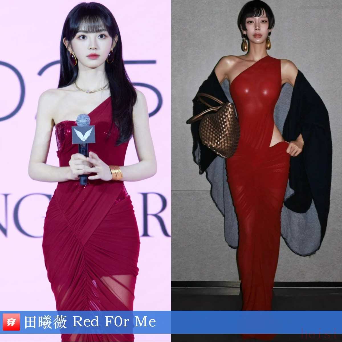 田曦薇,品牌活动。红色斜肩镂空连衣裙:Red F0r Me。