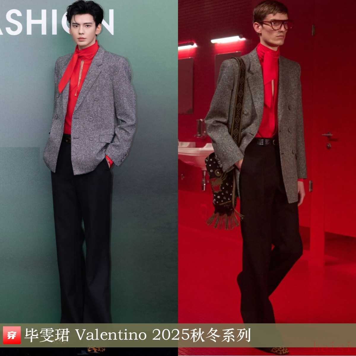 毕雯珺,2025年VOGUE时尚之力盛会。红色衬衣、丝巾、灰色双排扣西装:Valentino 2025秋冬系列。