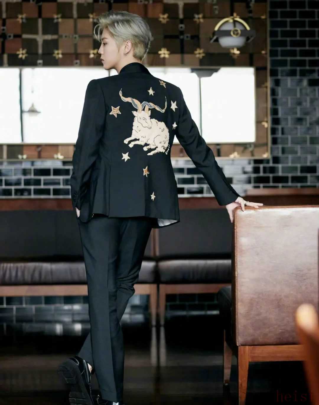 亮点还在后面,套装背后的白羊星座刺绣,也让黑色西装超越了正装范畴,得体有质的同时,更有趣味、文艺与华贵的流露。