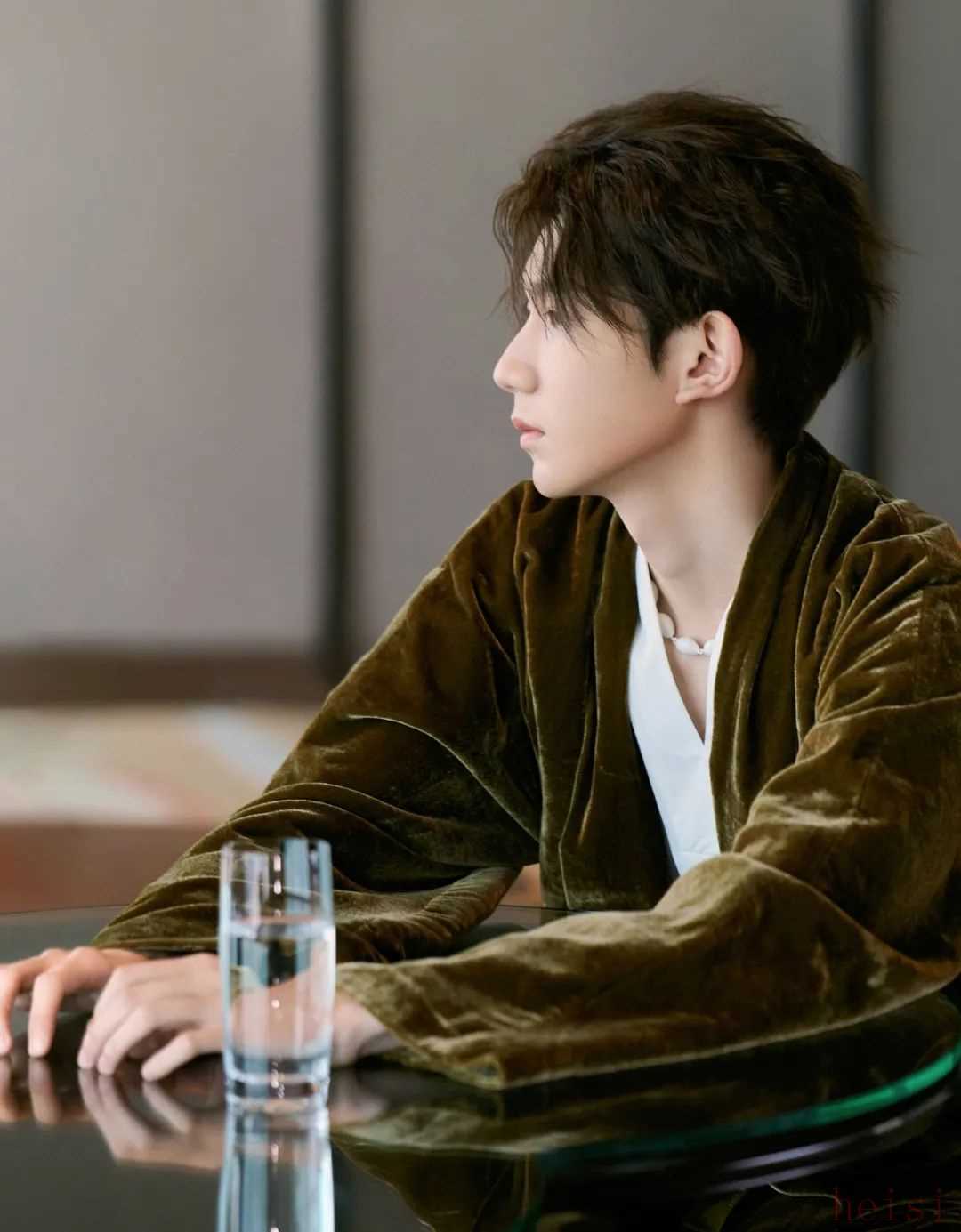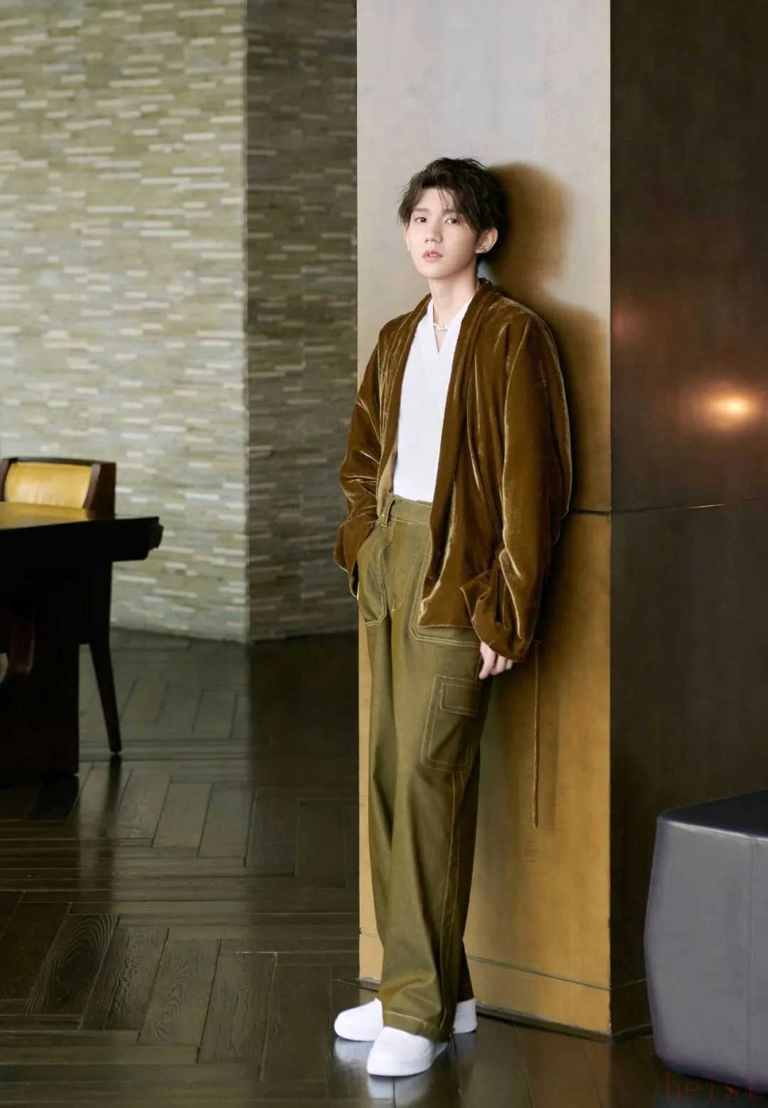 █ 王源这期穿的也是丝绒外套,来自国内设计师品牌 SAMUEL Guì YANG,廓形结构更加松软,内搭一件 V 领T恤,营造出了东方美学意境中特有的禅意感受,静谧随性。下面选择了很有混搭感的工装裤款,上半身是慵懒自在的,下半身则强调存在,韵味与潮流同在。
