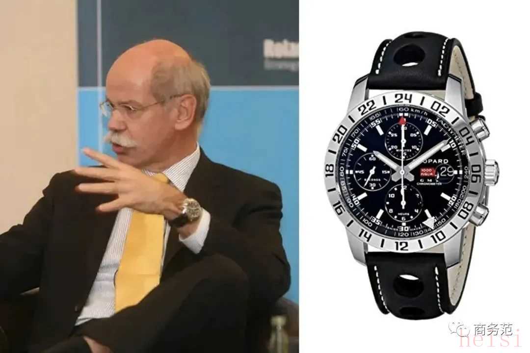奔驰前总裁蔡澈常戴的表也是和车有关,来自萧邦的Mille Miglia经典赛车系列系列,很有运动感。他这枚是老款了,现在能买的新款价格在5-6万。