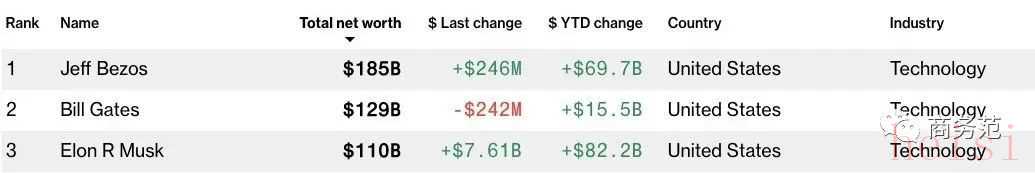 虽然扎克伯格被挤出了前三,但霸占全球富豪榜的前三名的贝佐斯、比尔·盖茨和马斯克,依然都来自科技领域。