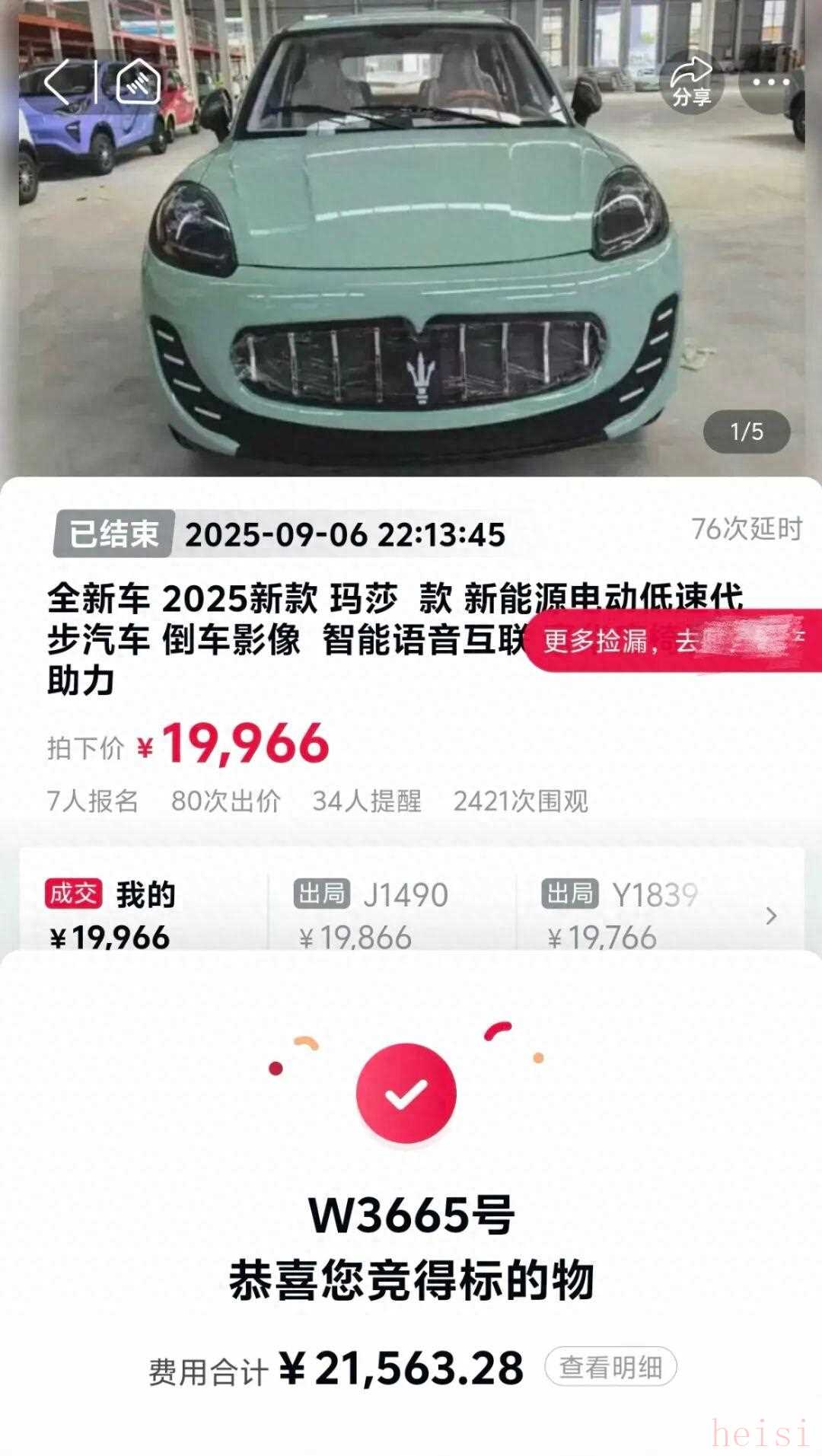 拍卖页面显示,这款车起拍价为166元,拍卖页面的标题写着“2025新款玛莎款新能源电动低速代步汽车”,车标与玛莎拉蒂的商标非常相似。标的物属性一栏,显示该车为新车,机动车分类为商用车,燃料类型是纯电。