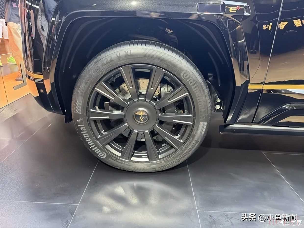 仰望U8L提供了23英寸的八孔锻造轮圈,兼顾美观与实用性。同时,其轮圈中心采用了悬浮式轮芯盖,使轮芯盖保持垂直。仰望U8L胎宽由标配的275增加至了285,更宽的轮胎与庞大方正的车身更为契合,也能带来更好的抓地力表现。值得一的事,仰望U8L最大的变化,是尾部取消了外挂式备胎设计,后保险杠造型进行了简化,更符合商务行政的气质。此外,仰望U8L标配上下对开式电动尾门,尾门支持两段独立开启以及多种开启方式。其中,下尾门不仅可以有效防止开门时物品滚落;同时开启后可供用户乘坐或临时承重,最大承重200kg。