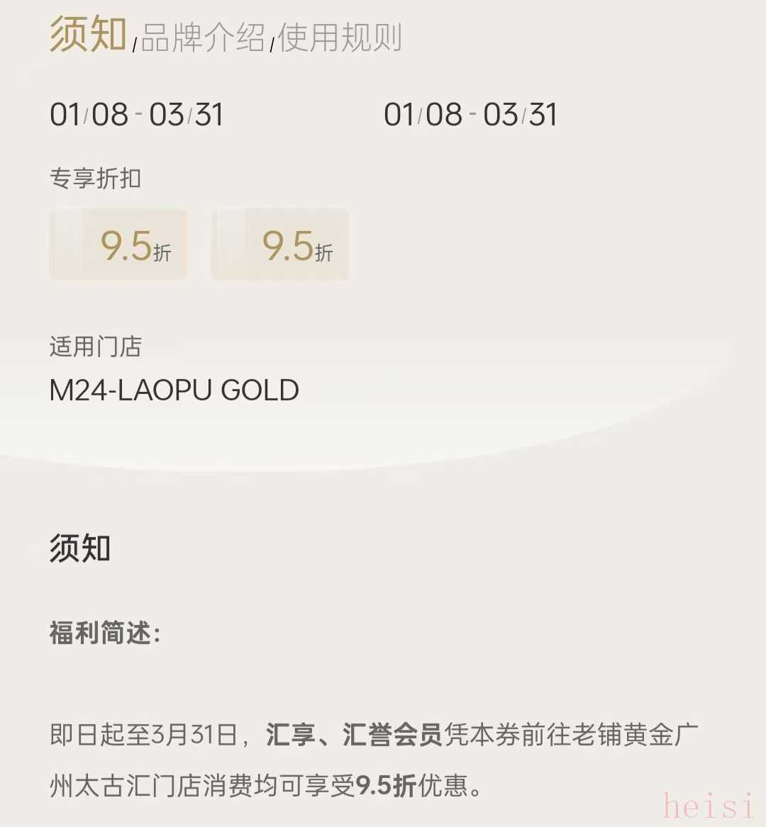 据了解,要成为老铺黄金的金卡、黑金卡会员,需正价商品累计消费满30万、50万。本次商场活动打出的9.5折优惠截止到3月末,这或是吸引客群争相前往消费的重要原因之一。