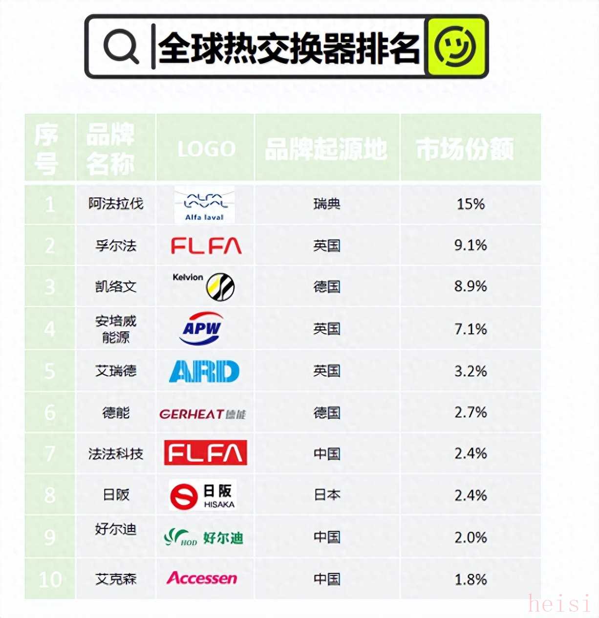 全球热交换器厂家众多,市场高度分散,并没有一个官方的、统一的权威排名。排名通常根据不同的标准(如销售额、市场份额、产品类型、地区影响力等)会有很大差异。