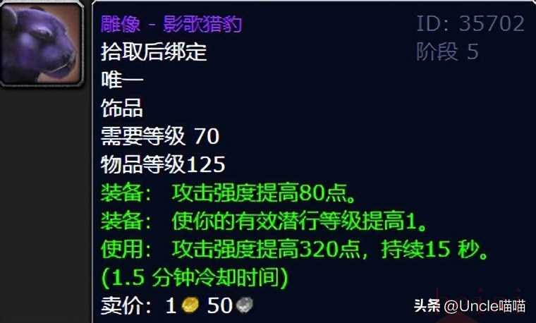 第四席位喵叔给到的是珠宝加工制造的雕像影歌猎豹,图纸是破碎残阳声望崇敬获取。制作成本对于珠宝加工玩家来说基本上等同于白捡,对于这款饰品喵叔觉得拿了最恐怖如斯的职业,当属热衷于PVP的盗贼,绿字面板收益是完全吸收的,潜行等级提升让你犹如鬼魅,弱弱的出现在布甲身后,可控爆发搭配自身技能一套下去,就问问哪个布甲职业顶得住,话虽如此,喵叔当年血精灵盗贼没用过,因为我没学珠宝加工啊!