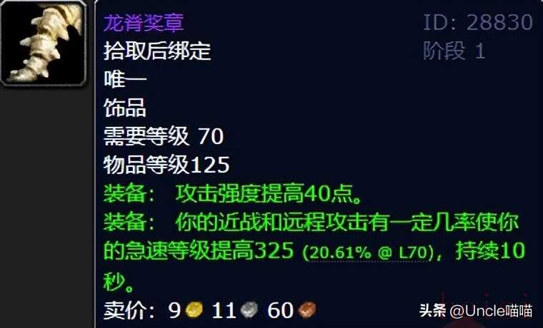 格鲁尔巢穴出品的此款龙脊奖章,虽然常驻攻击强度提高只有40点,比之牌子饰品嗜血胸针,还足足少了32点之多。但他却是TBC版本名副其实的最保值饰品,因为其被动10秒325急速等级提高收益着实恐怖如斯,而且还具备其他饰品不拥有的极致成长性,喵叔愿称龙脊奖章为TBC版本的代名词,不能说是神器,只能说是超级神器!