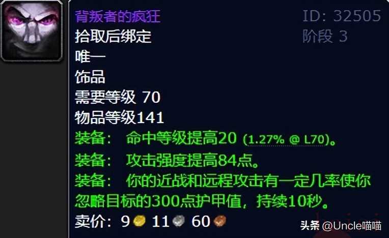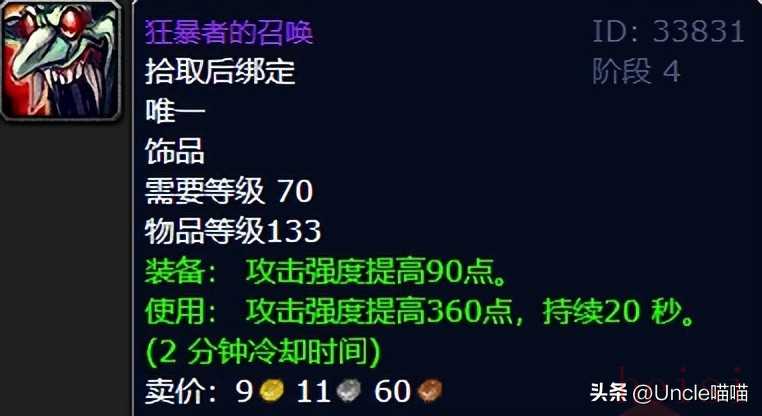"评价:" 这是TBC版本中最被广泛认可的“神级”饰品之一。高额的攻强基础加上高额的暴击率,使其在任何需要攻击力的职业和副本中都极具吸引力。尤其是对于物理DPS职业来说,暴击率是稀缺且重要的属性。虽然它的暴击是百分比伤害,但在TBC的暴击伤害计算方式下,全额暴击依然非常可观。它的获取方式也比较多样(任务、拍卖行等),相对容易获得。